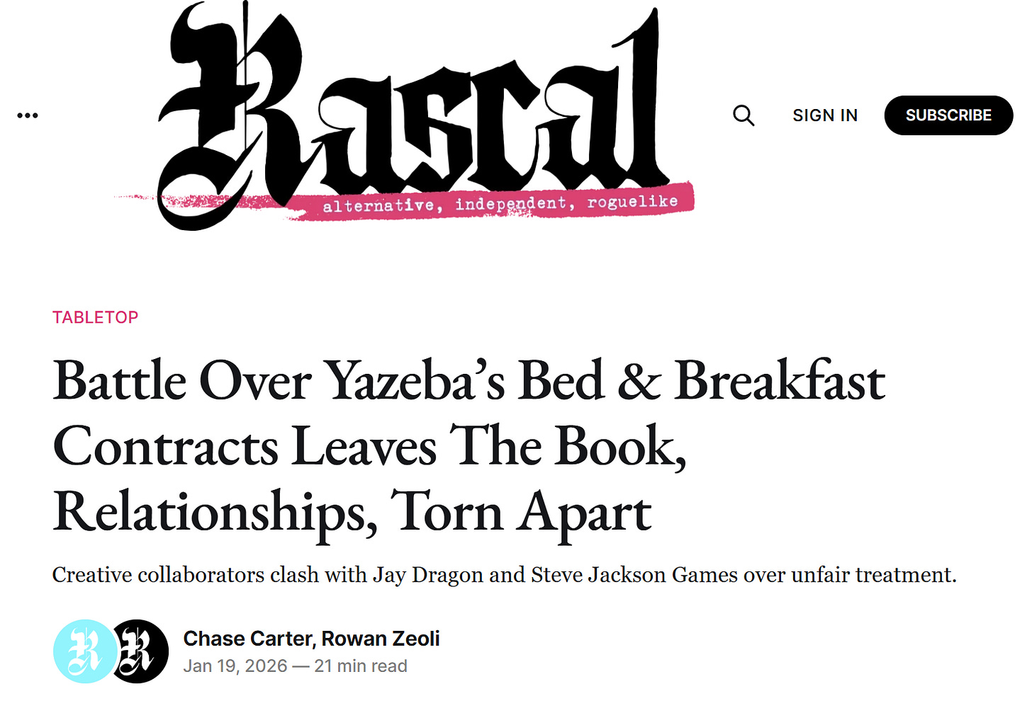 Rascal published an extensive article digging into a bunch of things gone wrong with the continued production of Possum Creek Games’ Yazeba’s Bed & Breakfast. It’s an interesting, often frustrating, read in its own right, but it also shows the continued trickle down effects of the PlusOneExp/Brandfox situation I was caught up in several years ago. If you aren’t subbed to Rascal, I’d recommend it.