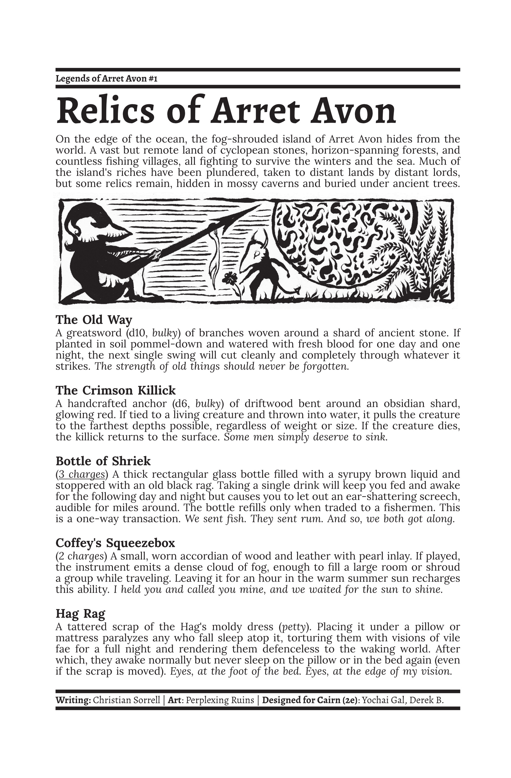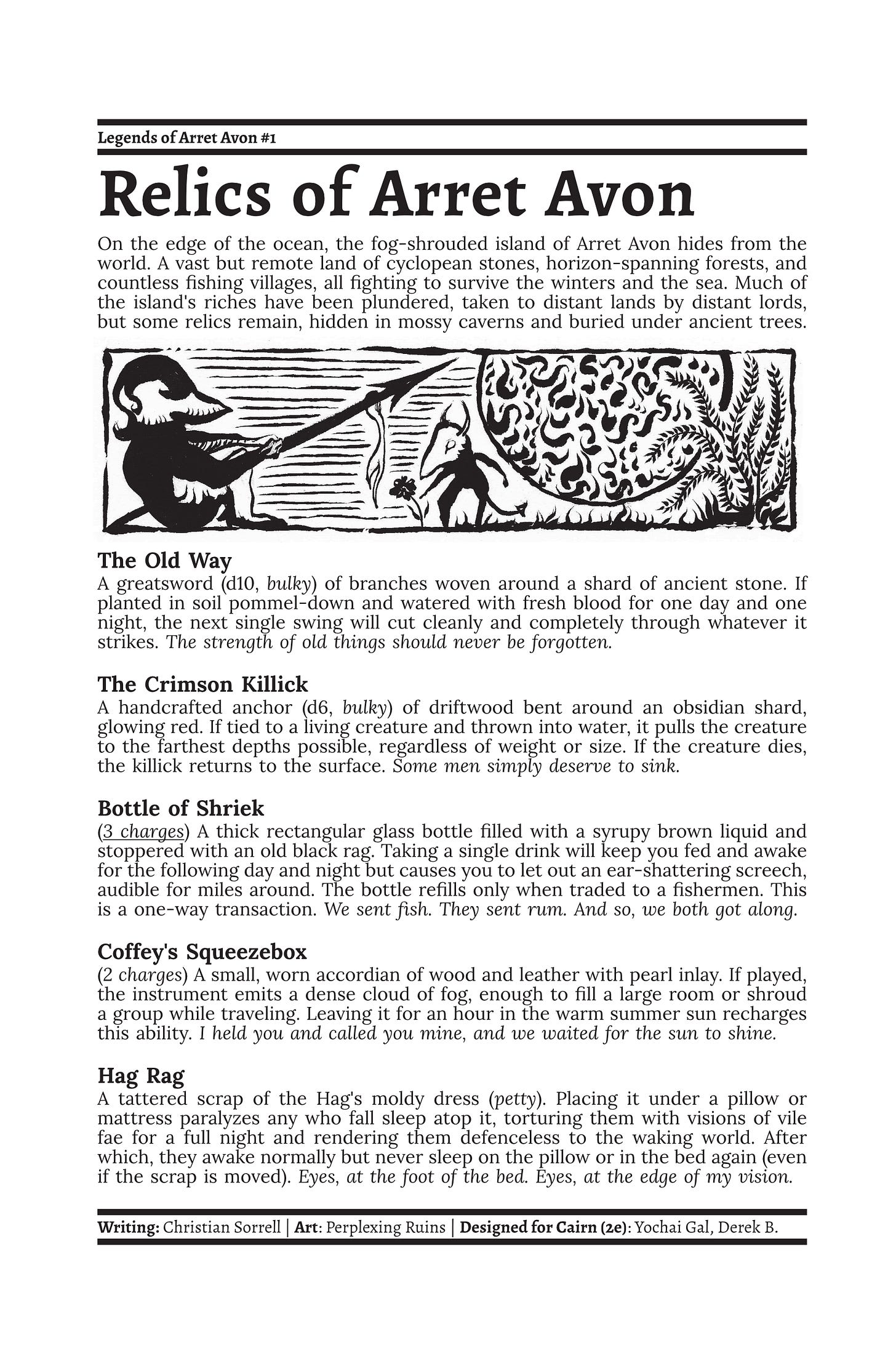 I have been playing and thinking about Cairn a lot lately. Here is a collection of five new relics created as part of one of my new campaign settings, Arret Avon - a Newfoundland-inspired fantasy setting for my campaign blending Cairn with a few more traditional DnD-ish elements. That said, these relics can easily stand alone in your core Cairn experience (or almost any fantasy game of your choice). Enjoy!